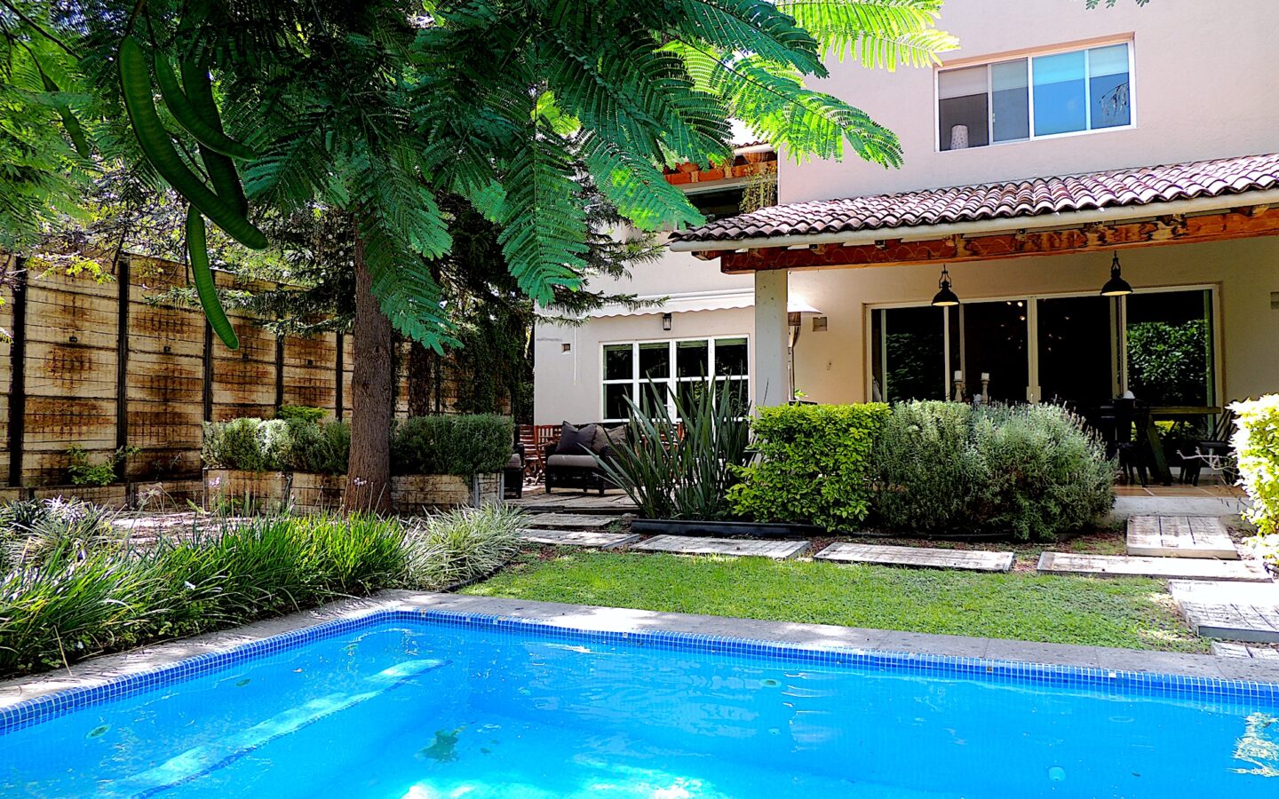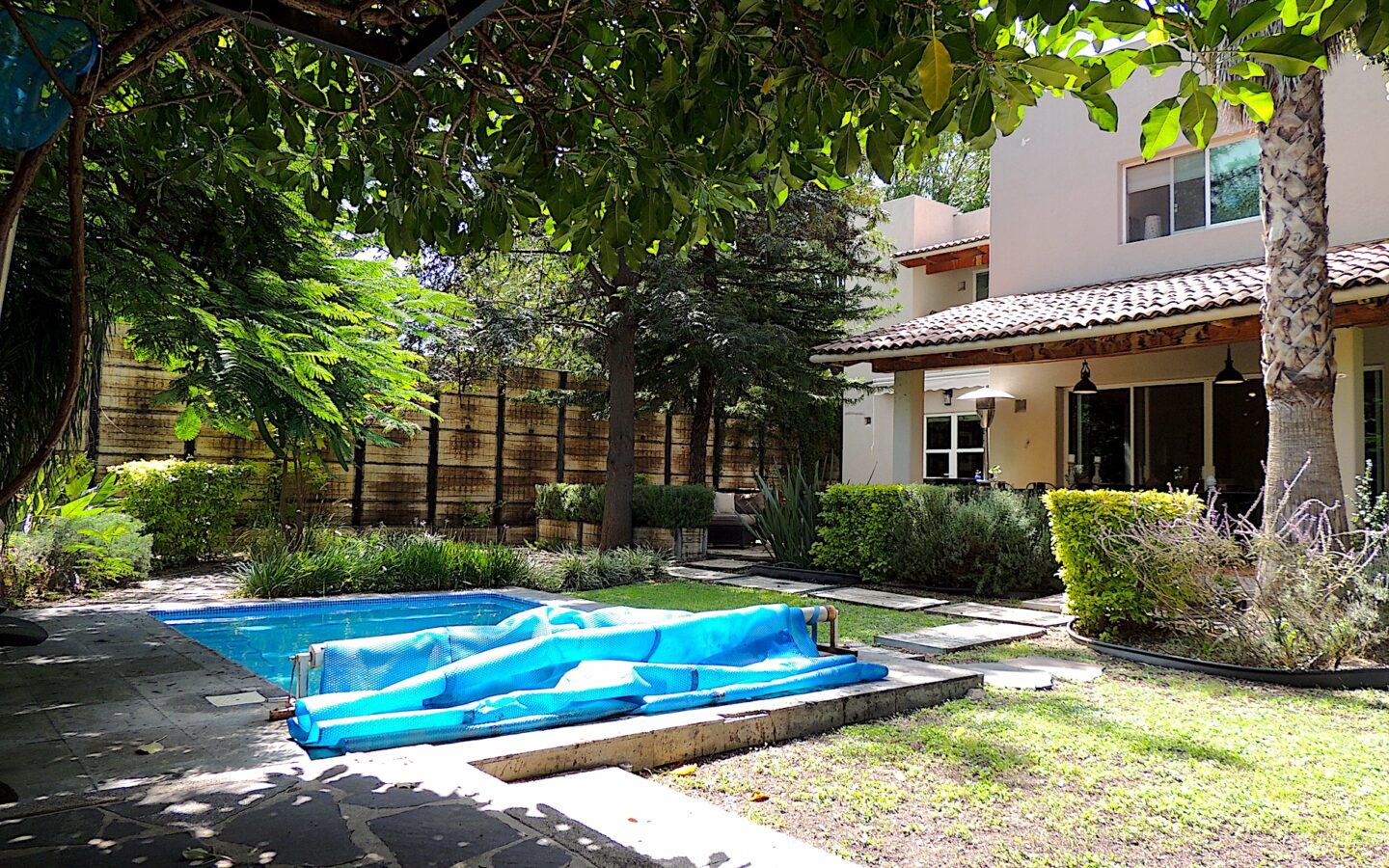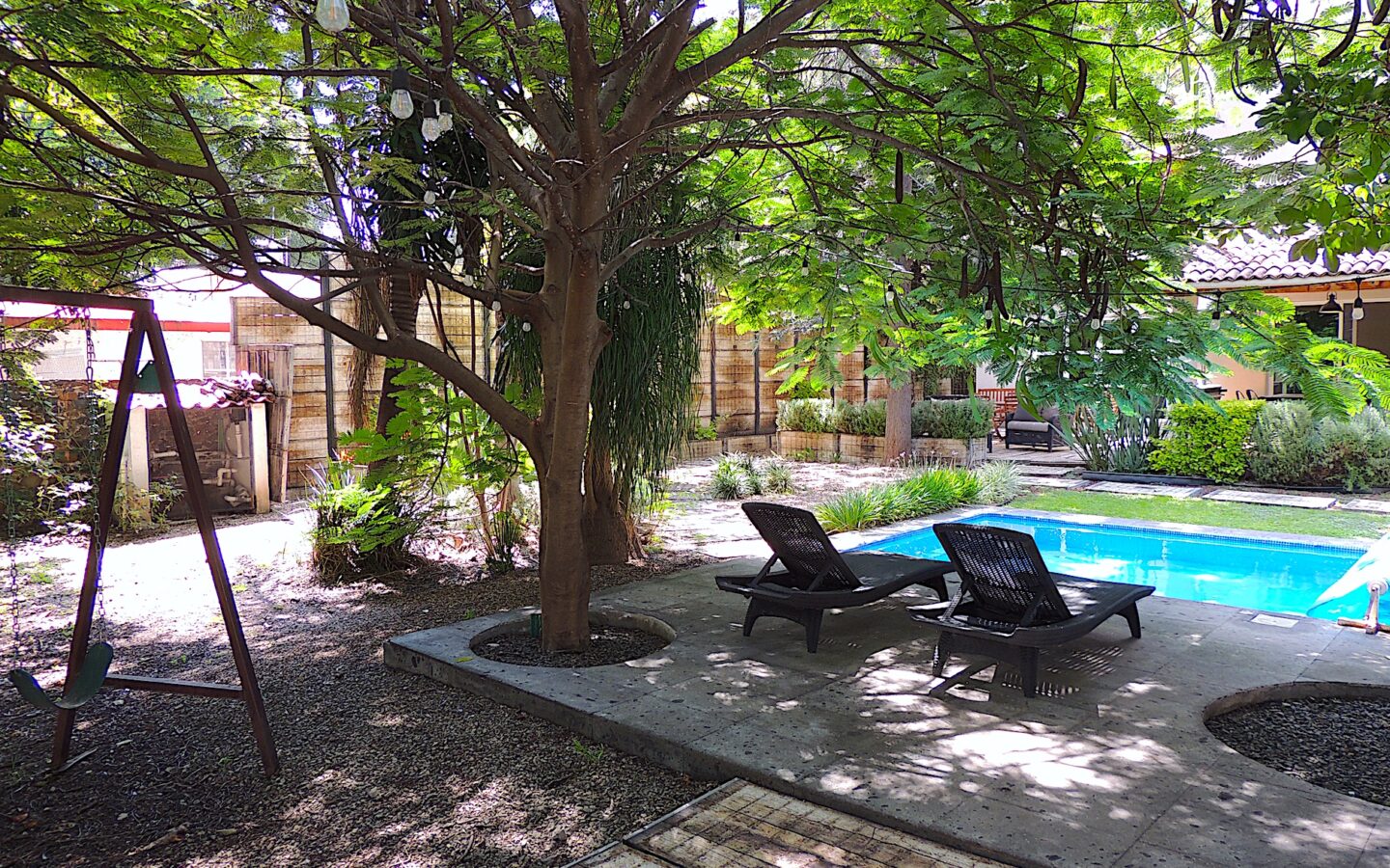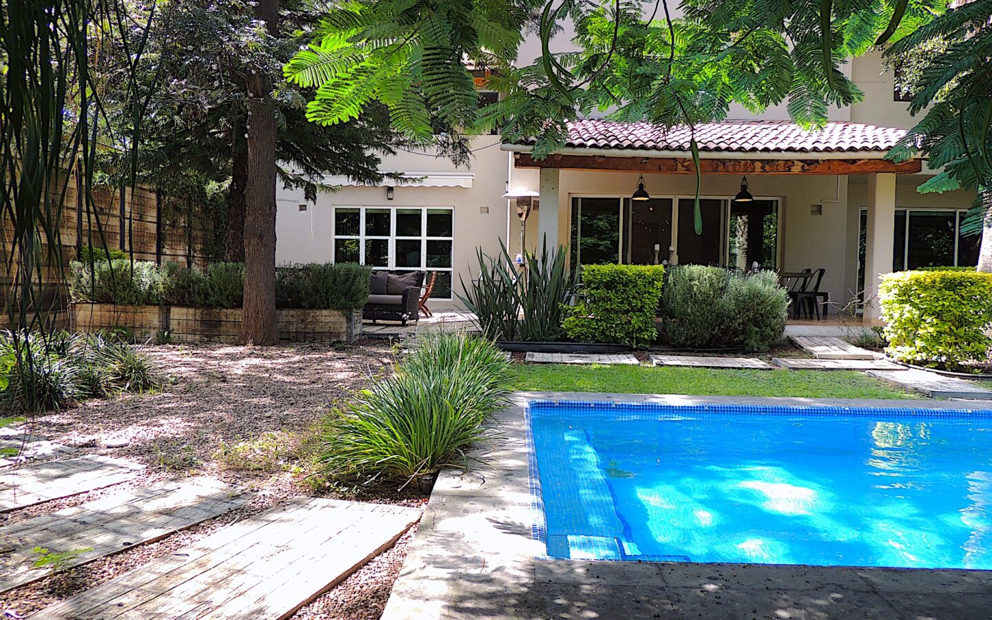 En el área de jardín, cuenta con alberca, dos terrazas, una pequeña y la otra acondicionada con asador y todo lo necesario para disfrutar con amigos y familiares de eventos sociales. Dos medios baños para dar servicio a esta zona.