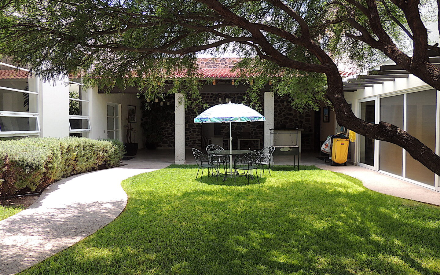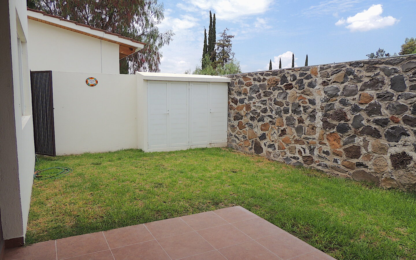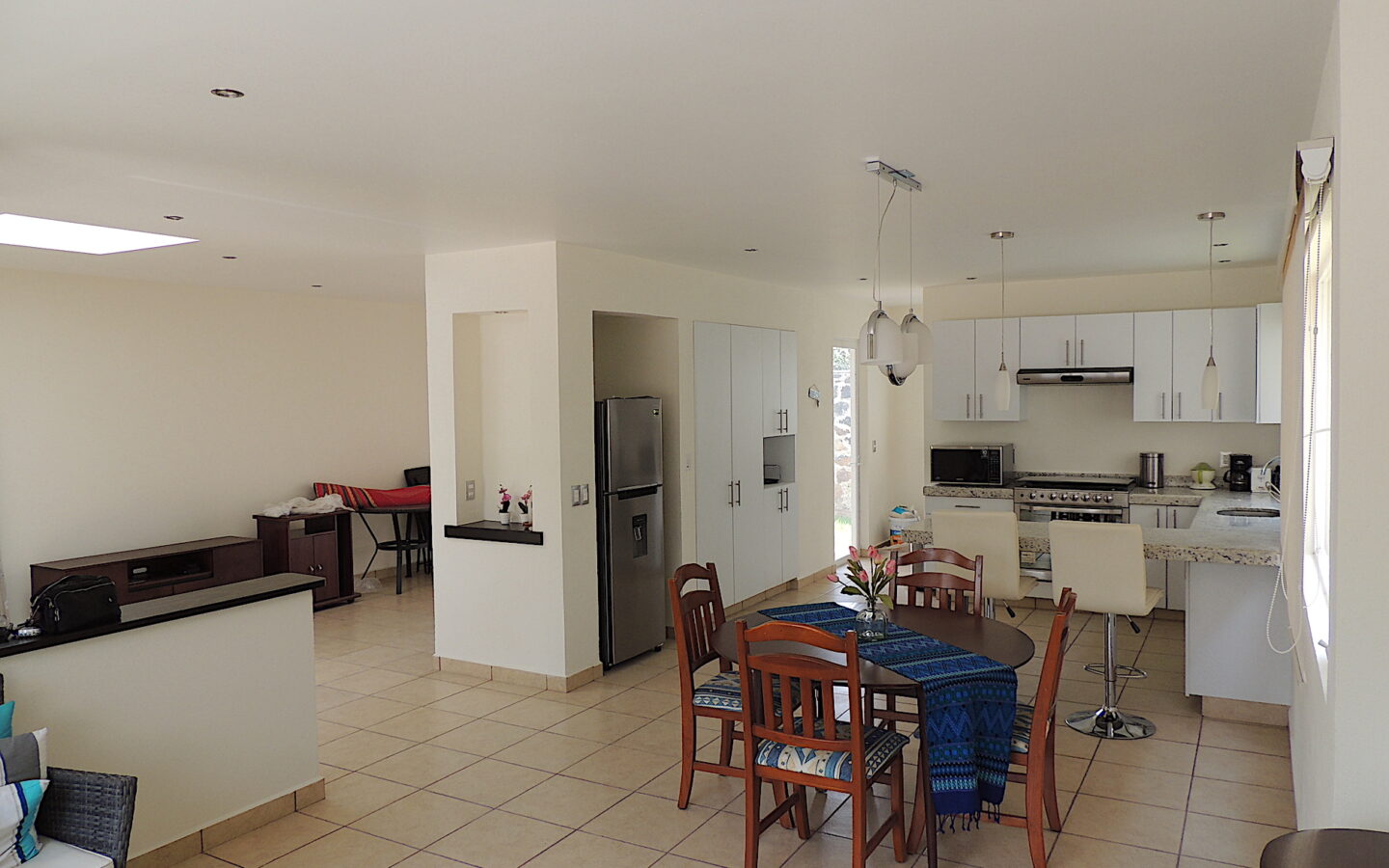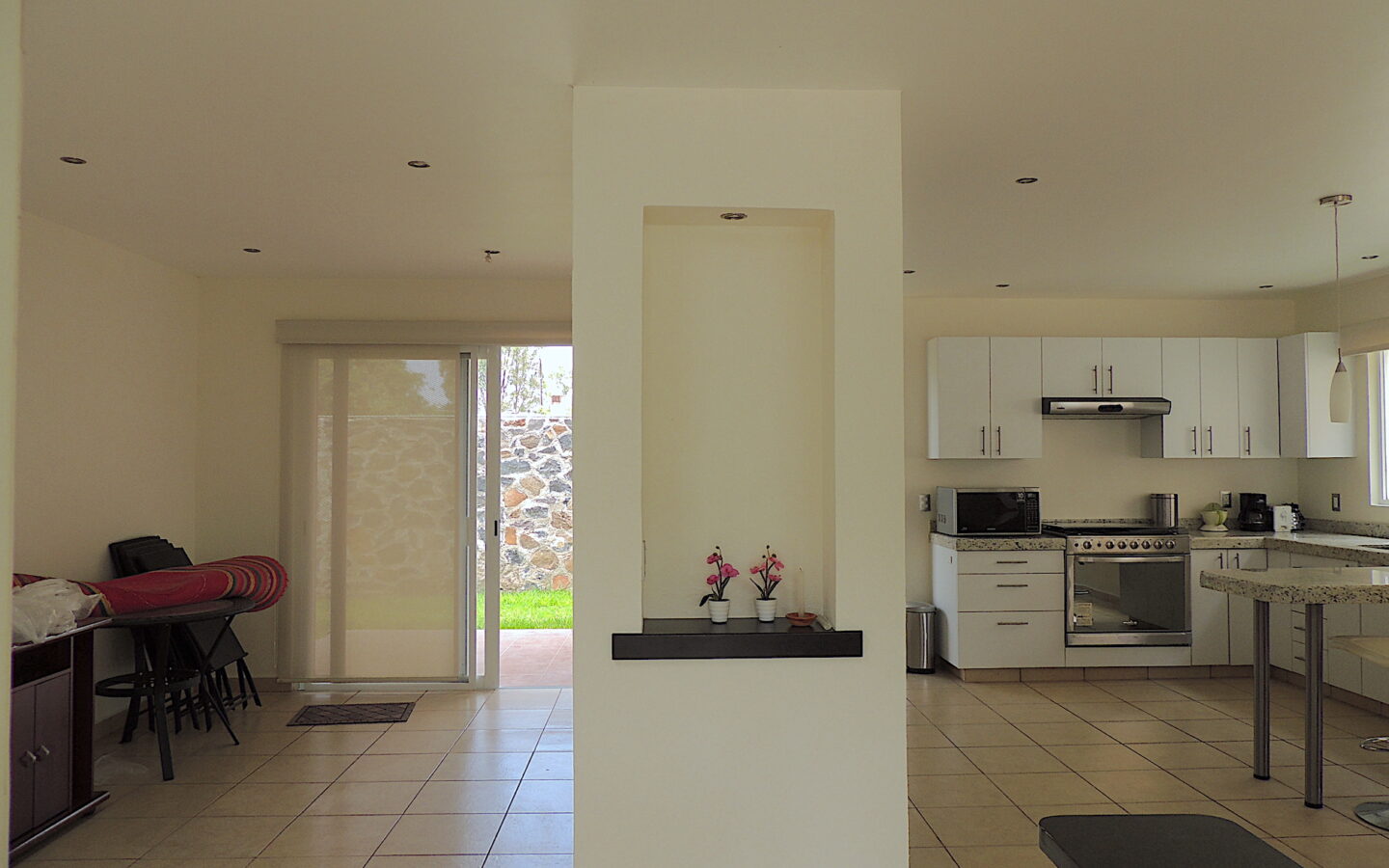 Estancia abierta con cocina integral, barra desayunadora, área de lavandería, agradable terraza con jardín y bodega.