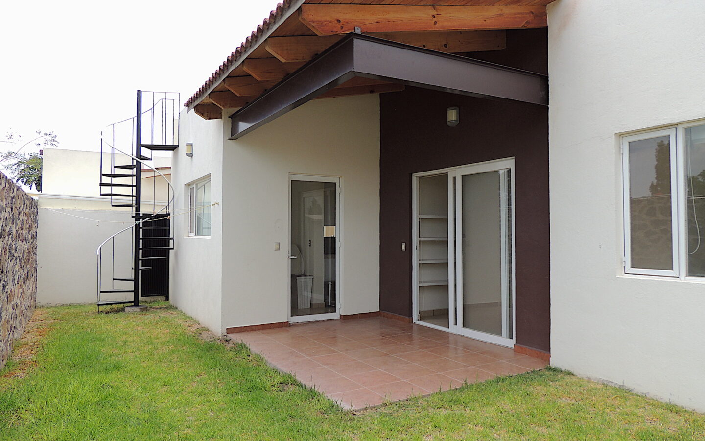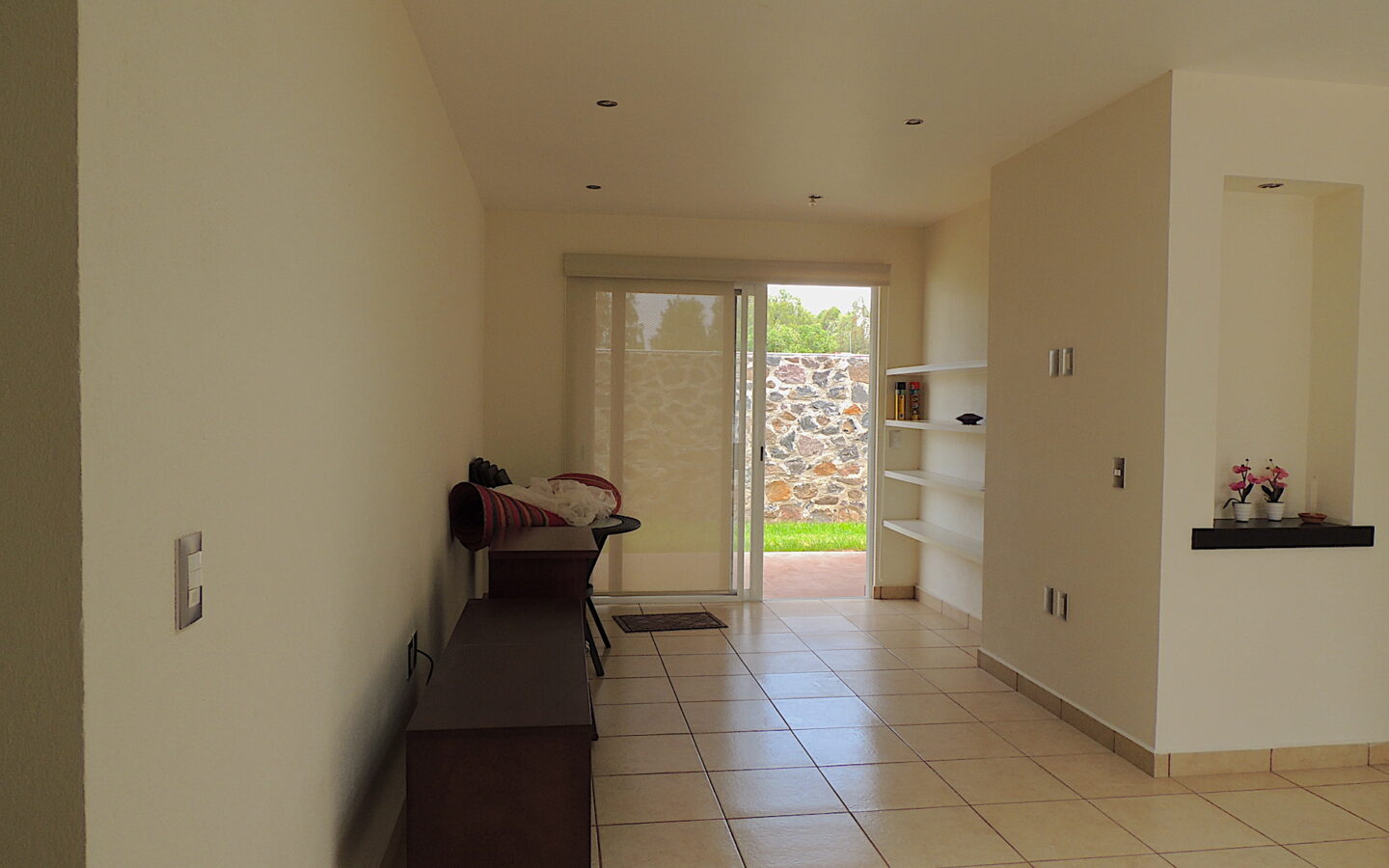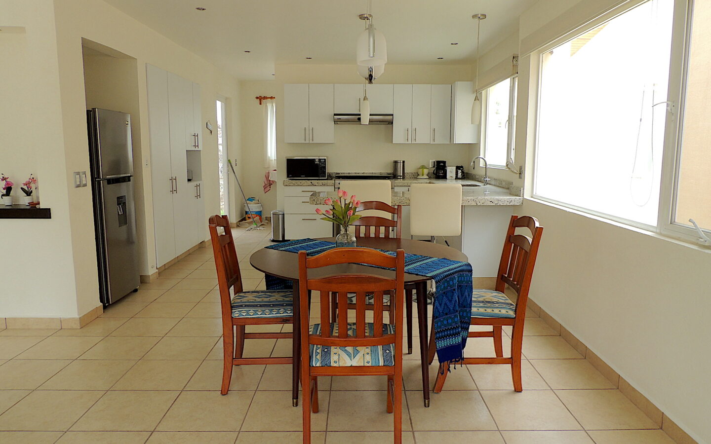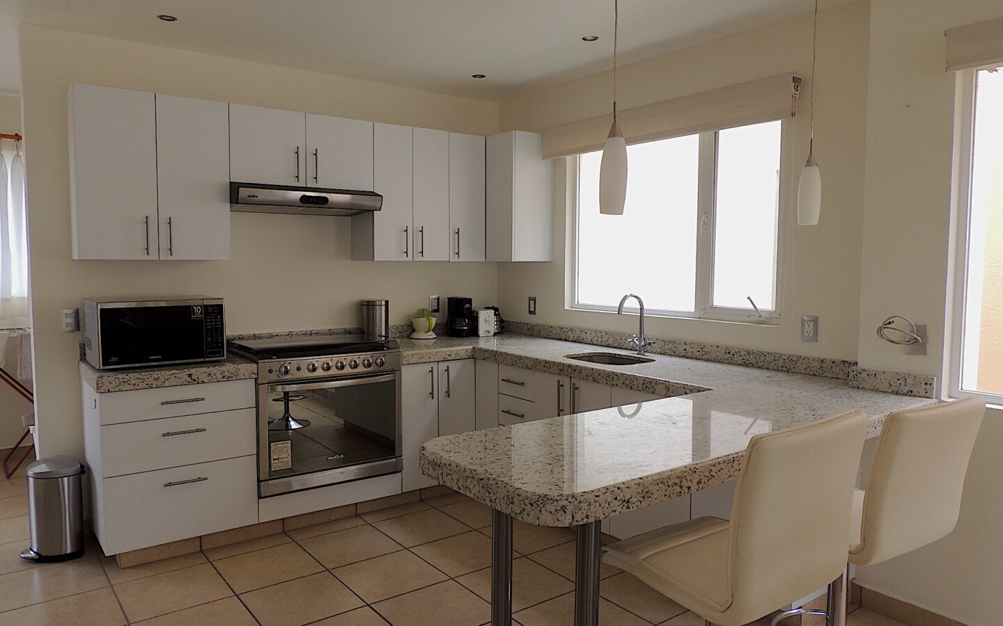 Estancia abierta con cocina integral, barra desayunadora, área de lavandería, agradable terraza con jardín y bodega.